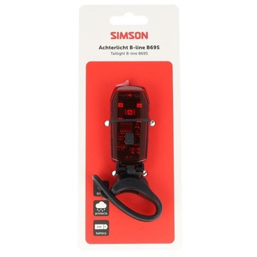 Simson achterlicht Aurora B-line B69S Krachtig en veelzijdig. Met 5 LED\'s biedt dit batterijlicht een opvallend heldere lichtbundel. Eenvoudig te monteren op de zadelpen, ideaal voor sportieve fietsen.