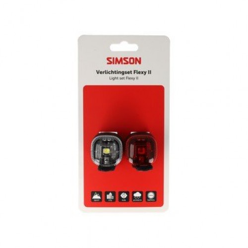 Simson verlichtingsset Aurora Flexy II Eenvoud in montage en gebruik. De Flexy II is ontworpen voor snelle montage zonder gereedschap. Een betrouwbare basisset voor dagelijkse ritten of als back-up in de fietstas. Inclusief 4x CR2032 batterijen.